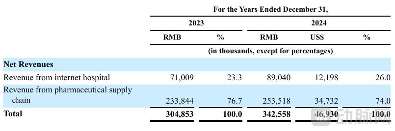 2023年、2024年,石榴云医分别实现了约3.05亿元(如无特殊说明,全文均指人民币)、3.43亿元的收入,以及产生3690万元、3740万元的亏损。公司收入主要来自互联网医院和医药供应链两大业务板块,其中互联网医院收入占比小,但盈利能力更强;医药供应链收入占比高,但毛利率较低,这与以往电商属性的平台状况相似。