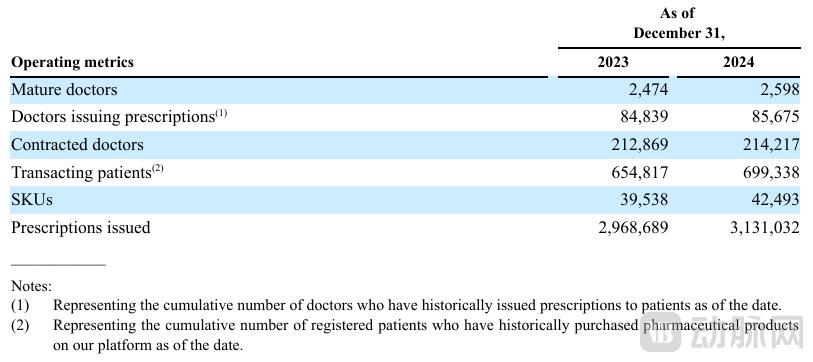 石榴云医平台上的医生情况,是行业的一个缩影。招股书显示,截至2024年底,平台签约医生约21.4万人(通过执业资质认证,可开展线上诊疗及开具处方的医生);实际开具过处方的医生人数为85675人,成熟医生2598人(一个月内为20个以上患者开具处方的医生)。