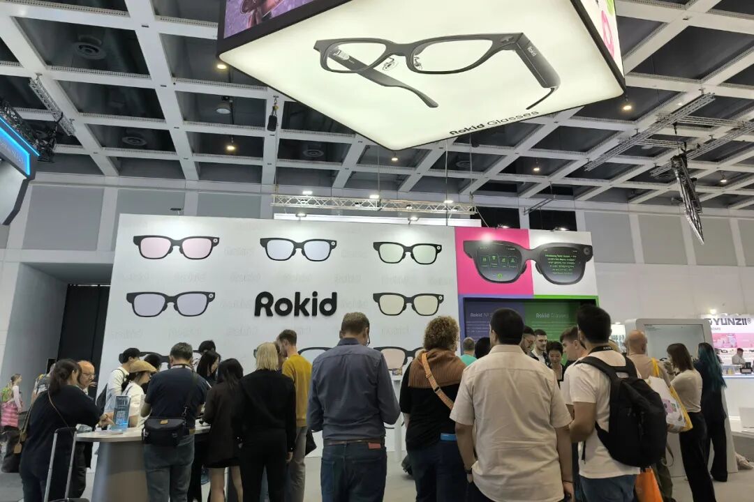 影石孵化的 Antigravity 全景无人机品牌在 IFA 正式亮相。图片来源:36氪出海 4,初创品牌的全球化之路而对于初创品牌们来说,还尚且需要在各自赛道的单行线上继续前行。在本届展会的20多个主题场馆里,我们遇见了众多来自不同行业、不同形态的消费电子产品初创企业,展现出中国出海品牌们旺盛的生命力和创新力。 智能眼镜品牌 Rokid 携其最新发布的 Rokid Glasses 来到了柏林。这款搭载双屏幕 AR 显示、12MP 像素摄像头、高保真开放耳机、支持89种语言实时翻译和 ChatGPT5 接口的智能眼镜,以其49克的重量和时尚的外型吸引了大批科技粉丝前来展台体验。尽管国内版本已经上市开卖,Rokid Glasses 的海外版本目前依然处于 Kickstarter 众筹阶段。而在众筹目标早已超额完成、取得海外用户超过100万美金承诺的情况下,首款 AI+AR 智能眼镜产品的产能和全球交付将是 Rokid 接下来面对的最大挑战。