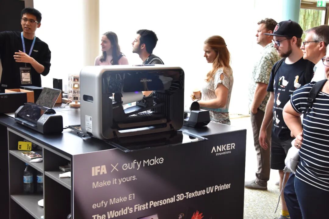 安克创新创始人阳萌在 IFA 现场发表主题演讲。图片来源:36氪出海 而安克庞大产品线的展示则被交给了清一色的外籍团队。3D立体打印机 eufy Make 是安克在本次展会上主推的新品。作为全球首台消费级3D立体材质打印机,eufy Make 在众筹平台 Kickstarter 上获得了史无前例的4600万美元成绩,预计将于今年12月在欧洲上市,零售价2499欧元。这款能够在不同材质与弧度的表面上打印立体彩色图案的设备,配备了拥有 AI 图像生成功能的打印设计软件,吸引了参观者们的浓厚兴趣。对追求个性化的欧洲市场来说,这样的产品不仅仅是一件发挥创造力的极客玩具,同时也是一件充满想象空间的生产力工具。