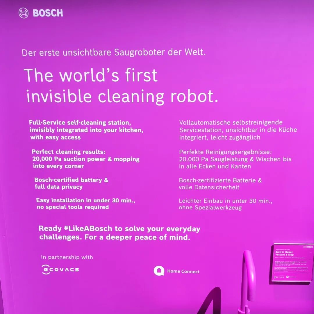 石头科技发布全新四驱割草机系列产品。图片来源:36氪出海 清洁机器人领域资历最深的中国选手科沃斯 EcoVacs 则把重点放在了洗地产品上。在 IFA 现场,科沃斯发布了全球首款具备“无限续航”能力的滚筒洗地机器人 DEEBOT X11,以及添可品牌下的手持洗地新旗舰 FLOOR ONE S9 Scientist 系列。尽管在欧洲市场的增长被石头科技超过,但科沃斯2025年上半年度的利润表现却远高于对手,而这其中洗地机器人品类的收入贡献占据了近60%。 在经过德国家电巨头 Bosch 展厅的时候,我们意外地发现了一款科沃斯与 Bosch 联合研发的产品。这款面向欧洲高端市场的清洁机器人将基站隐藏在一体化橱柜的内部,能够自动清理垃圾袋、进行清洗和加水工作,并集成在 Bosch 智能家居 App 生态之中。这是在本届 IFA 上为数不多的、中欧头部科技企业之间产品深度合作的案例。